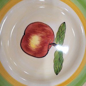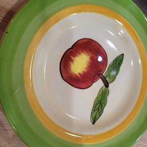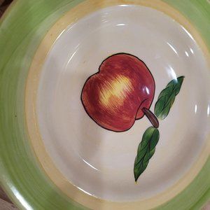 3 Tabletops Unlimited Hand Painted Retired Apple 8.75" Salad Plates. Green, white and yellow. One plate has a slightly lighter yellow band. No chips or scratches; some crazing. One plate has a very tiny dark spot as shown in the last image. All are in very good condition. (I've search for a 4th.If you have just one and want to sell it let me know.)