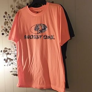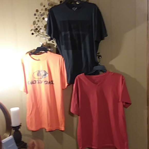 Mossy Oak, orange; Howitzer Pattiot, gray; Fruit of the Loom, rust and all size large. Gray tee is an American Pattiot. Like new.