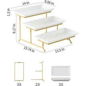 3 Tier Serving Stand with Porcelain Serving Platter Tray -Collapsible Gold Stand