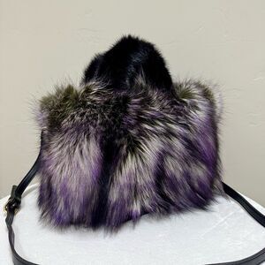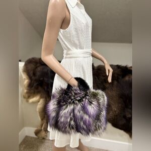 One of a kind! This stunning fluffy bag is handmade from premium genuine Fox fur with Mink fur handles. Dyed beautiful 3 tone fur color, olive to purple to beige gradient.