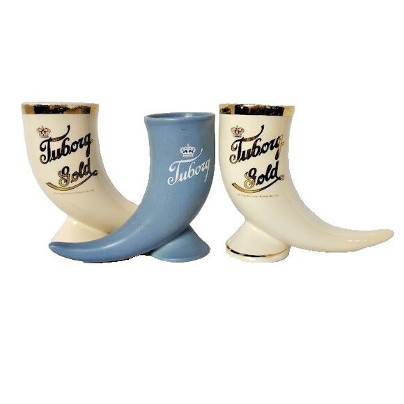 This product is a set of three ceramic beer mugs with a unique horn design, 2 featuring gold trim and all advertising the Distillery theme. The mugs showcase 2 different colors and each is an original piece of advertising collectible. The Tuborg and Tuborg Gold Horn beer mugs are not only functional barware and/or display pieces but also serve as stylish decor for any home or bar. Ideal for collectors or enthusiasts of vintage distillery advertising.