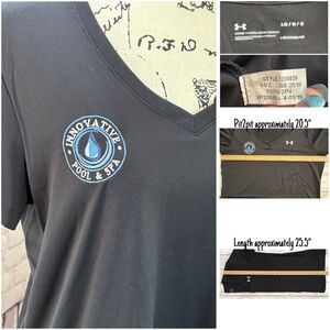 These tops are a classic in every way, featuring easy-going style paired with the relentless power of Under Armour's performance technologies. Made of knit HeatGear polyester. Features are a V-neckline with a finely ribbed band, Shallow sleeve design for a sleek fit, Extra stretch built-in for fuller range of motion, Signature moisture-transport system provides athletic-level sweat wicking and Anti-odor properties keep fabric fresher longer. Has Innovative Pool and Spas logo on chest. Colors are white (L), black (L) and light blue (XL).