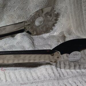 These vintage barbeque tools include a fork, turner and tongs. All have long handles for safety. Flipper or turner is 17.75 inches long. Fork is 16.75 inches long. Tongs are 16 inches long.