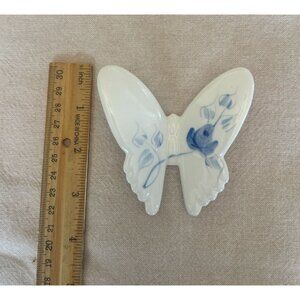 These porcelain butterflies feature a hand-painted blue floral design on white, adding elegance to to a wall and complementing various decor styles.
