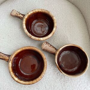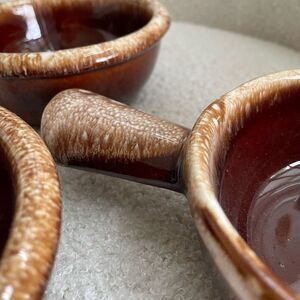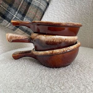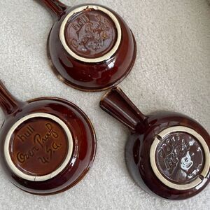 3 Vintage McCoy Hull Drip Glaze Pottery Soup Crock or handled Soup Bowls. Some are marked McCoy on the bottom and some are marked Hull. USA. One has a chip on the underside bottom ridge and one has a couple fissures in the same underside ridge. Doesn’t affect use, I used them without issue. Please check out my other dishes from this line. Please note the flat rate shipping up to five pounds. Bundles of multiple listings from my closet cost additional for shipping between 5-10 lbs. Let me know if you have questions, and I will work with you to make shipping as inexpensive as possible.