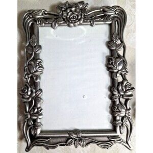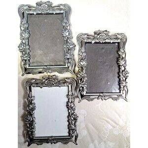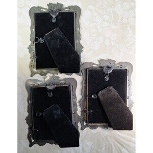 3 vintage 1990's pewter picture frames, with a rose scroll pattern and ornate design. The frames feature a rear-loading design for easy photo insertion, clear glass, and an antique brass finish. Measuring 4 1/2 x 6 inches, they are in a gray silver color and are perfect for adding a touch of elegance to any home decor. These decorative collectibles are a charming addition to any frame set collection.
