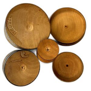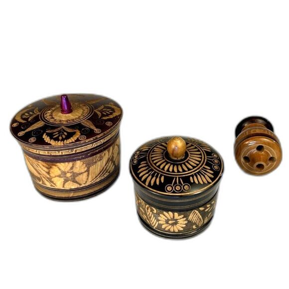 (3) Vintage Turned Wood Trinket Boxes (1) Signed by Pedro Preowned, excellent condition, boxes are clean with expected amount of wear & tear. These three boxes would make beautiful jewelry storage, attractive desk set. Boxes have been cleaned. (1) Large Bx Ht-4 1/4", Base 4", Top 4 3/4", Inside Depth 1 5/8" (2) Middle Bx Ht 3 3/4", Base 3 1/4", Top 3 5/8", Inside Depth 1 3/8" (3) Pencil Holder Ht- 3 1/4", Width 2", Base 2".