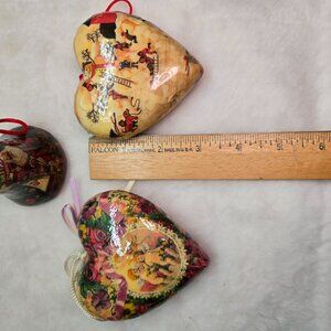Celebrate the holiday season with a touch of vintage charm with these 3 Victorian Decoupage Christmas Ornaments. Each ornament boasts a intricate Christmas pattern on a glossy paper mâché surface, combining classic elegance with a festive touch. The set includes two heart-shaped decorations and a bell, all strung on a satin cord for easy display. Crafted with care, these unbranded small-sized ornaments are perfect for adult collectors and Christmas enthusiasts alike. Their multicolored design adds a delightful pop of color to any Christmas tree, making them a unique addition to your holiday decor or a thoughtful gift for someone special. These are glossy and the pictures shown are reflecting the light, please zoom around to see the details. Check pics for measurements. Very Good pre-owned condition.