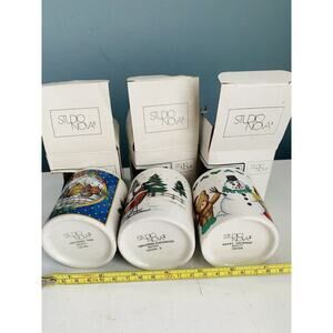 New in box with original votive candles. Add some festive cheer to your Christmas decor with these Studio Nova candle holders. The set of three features a variety of Christmas scenes, including a berry snowman and a sleigh ride. Perfect for creating a cozy and romantic atmosphere, these candle holders are sure to impress your guests.