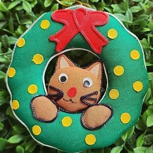 Yellow satin cat is wearing a festive red and green stocking cap and measures 8" x 3 1/2"