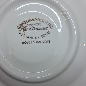 Vintage Homer Laughlin Century Service Autumn gold tea cup and matching saucer set of 3, featuring a yellow wheat pattern with gold trim. These cups were made in the USA in the 1950's and 1960's. They are made of porcelain or bone china. All preowned. No chips or cracks.