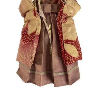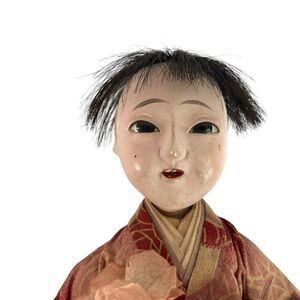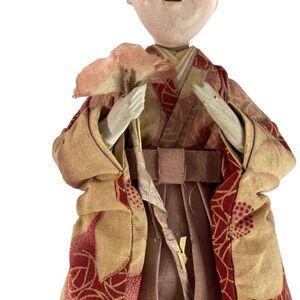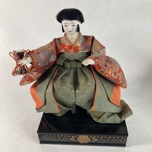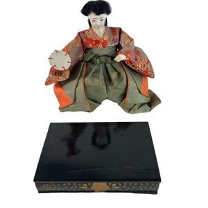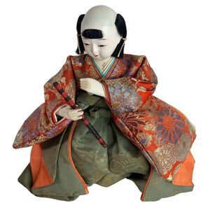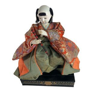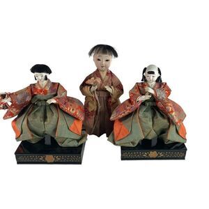 This listing features three vintage Japanese Hina Dolls, one standing boy doll and two Musicians on a Pedestal. These handmade dolls showcase the exquisite craftsmanship and rich culture of Japan. Add this unique set to your collection today! 2 musicians are 7" tall the 1 is 8" tall.