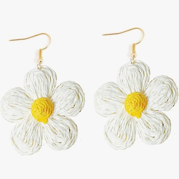 3" White & Yellow Raffia Flowers Oversized Statement Earrings Wicker Flower New