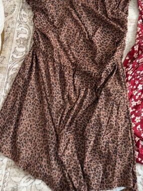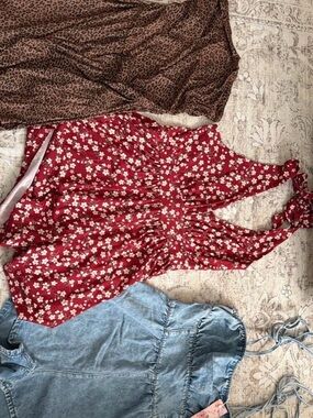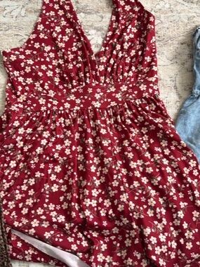 Soft red camisole with an all-over small white floral print. Tie-shoulder straps for an adjustable, feminine fit. Ruched bodice detail offers subtle shaping. Lightweight and easy to pair with shorts or jeans for everyday wear.
