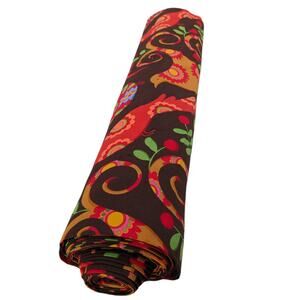Whimsical cotton quilting & sewing out of print fabric designed by Pillow & Maxfield for Michael Miller Fabrics in 2010. This psychedelic flower-bedecked bird fabric is in the Spice Palette - vibrant colors of peach khaki scarlet pink yellow green & blue on a chocolate brown background.