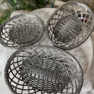 Add a touch of vintage charm to your home decor with these 3 beautiful woven wire metal baskets. The baskets come in three different sizes, perfect for nesting and displaying various items. Crafted with care in India, these baskets feature a lovely silver color and a metallic finish that will surely catch the eye. Ideal for all occasions, these wire baskets are a must-have for any collector of decorative items. The oval shape and the woven pattern of the baskets provide a unique and elegant look. Made of high-quality aluminum and metal, these baskets are durable and long-lasting.