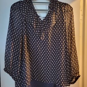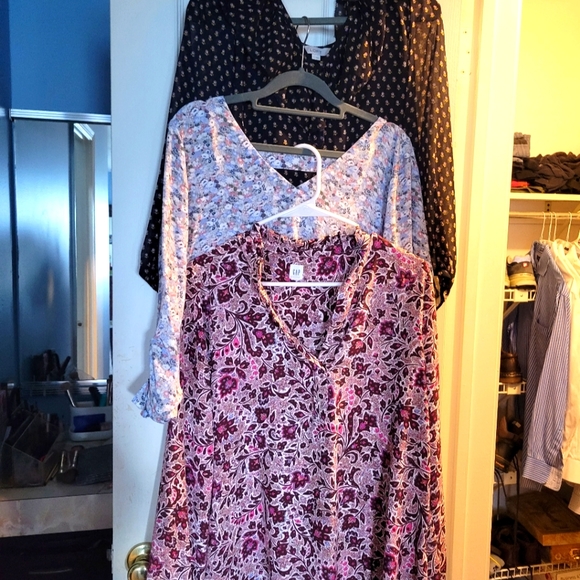 3 gorgeous work perfect blouses. navy one is loft size small, blue/purple floral is loft medium, pink/purple is gap small