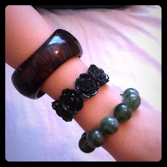 One wooden tiger print black and brown bracelet,one green marbled bracelet, & one black roses bracelet all together!
