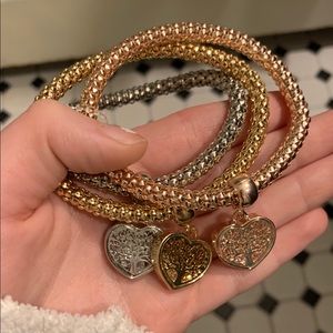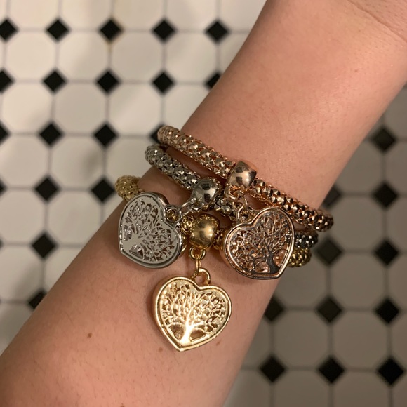 3 heart-tree bracelets. gold, silver, and rose gold.