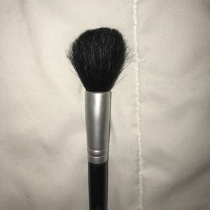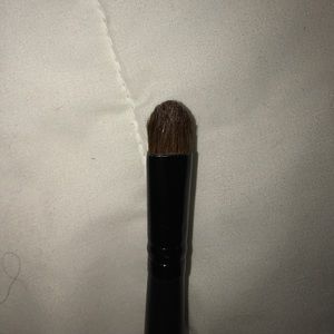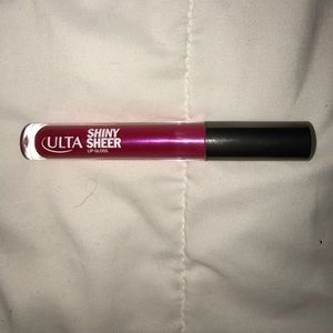 An ulta lip gloss, a black medium sized eyeshadow brush, a blush brush and a two in one brush w fan brush end and stippled brush end