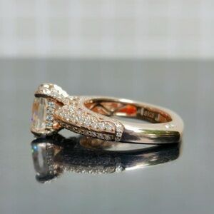 3 carat elongated moissanite center stone engagement ring. Pave set. 925 sterling silver in rose gold.