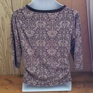 -Pullover cotton print top has chocolate brown sateen edging at neckline and around a front button placket with small rounded buttons. Has 3/4 sleeves and a scoop neck. Extra button sewn in next to materials tag.