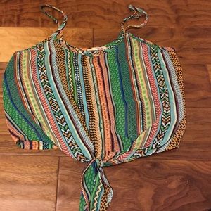 Bundle of 3 crop tops w/ different patterns. All size Small. First is black and white cheetah print, second is brightly colored v-neck top w/ tribal pattern & knot in the front, last is a black top with white lightning pattern. All from Fashion Q, all barely worn and no stains or rips.