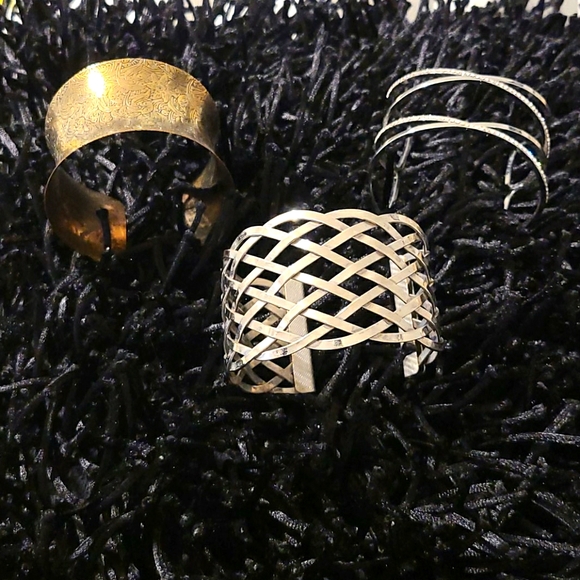 3 cuff bracelets 1 gold, 1 silver with rhinestone and 1 silver braid
