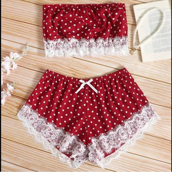 Adorable red with white polka dots and lace trim strapless bandeau top with short shorts! Retro pinup girl style