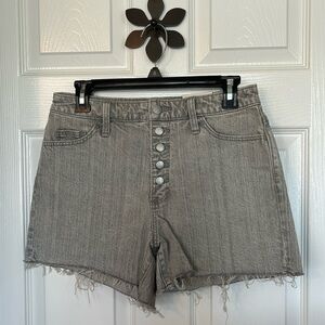 These shorts are NWT. They are washed gray. They are designed for a vintage look. They have a slight stretch. They measure 15” waist, 19” hips, rise from inseam 11.5”, inseam 3.5”.
