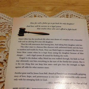 Breach of Promise by Christian fiction writer James Scott Bell. 2004 paperback in good, clean used condition with light cover wear and one crease on cover. I actually caused this when I dropped it. Sorry about that. The crease should relax over time. An emotionally gripping story of love, hope and perseverance as one man faces impossible odds armed only with his emerging faith in God.