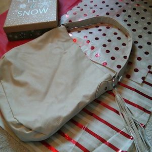 Never used bag by Bongo in faux leather with fringe tassel. Measures approx 15 by 17 inches.