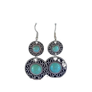 New dangle silver tone antique finish turquoise drop circular double earring design smaller top larger bottom boho. Box 54