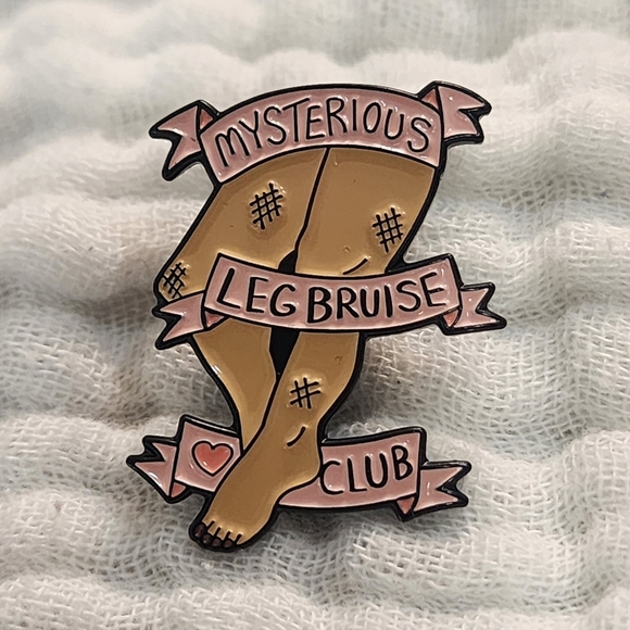 NWOT "Mysterious Leg Bruise Club" enamel pin. Metal with enamel coloring. Comes with rubber back fastener.