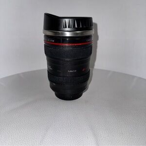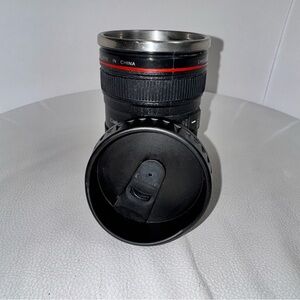 This listing is for a pre-owned Great Condition "CANIAM" Faux 5.5" Camera Lens Travel Coffee Cup. This travel mug looks like a genuine camera lens. Perfect gift for those photographers in your life or just avid artist coffee drinkers. Lid fits tight it will not just come off because the coffee cup falls over! Great for the car or office.