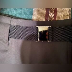 Cute gold belt that is easy click. Doesn’t adjust and has some scratches as pictured. Still very cute.