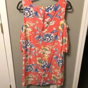 Umgee USA Dress in coral with Floral Detail. Dress has straps over the shoulder with a separated cap sleeve. Super comfy and lightweight. Worn once. I am about 5’5” and the dress sat halfway up my thigh past the knee; anyone much taller it may would be too short.