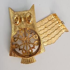 Vintage golden owl peefume locket brooch from Avon. The jewel eyes are missing, but otherwise in good condition.