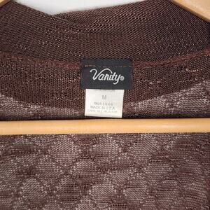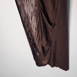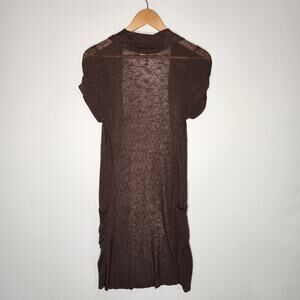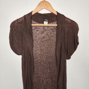 Long brong short sleeve cardigan sweater from Vanity. Open front. Lightweight knit. Gathered sides. There is a pulled thread on the lower left back but not really noticeable. 100% rayon