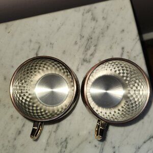 Beautiful set of hammered copper-tone Moscow Mule mugs with gold-tone handles and stainless steel interiors. Great for cocktails or stylish kitchen decor.