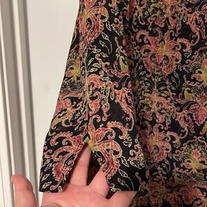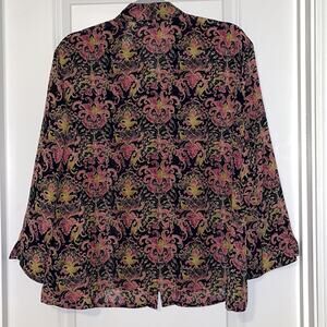 Emma James medallion print top, size 16. Pink, purple and green medallion print on black background. Semi-sheer fabric, 3/4 sleeves with slitted cuffs, side slits at bottom hem, button down front with collar. In excellent used condition.