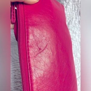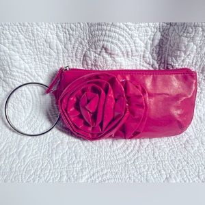 *3 for $20* Hot pink faux leather wristlet, circle handle, rosette design.