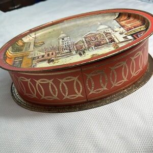 Metal box for storage. Some of the paint is worn off around the edges (see photos) but the artwork is spectacular! No dents and top fits securely.