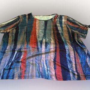 Vibrant t-shirt with multicolor stripes. Features shades of red, blue, and black. Open shoulder/arms with a tie string. It says 5x but fits more like a 2x/3x