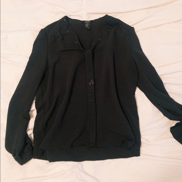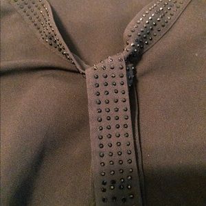 Black blouse with black sparkly studs. Studs are lined around the neck and down the ties