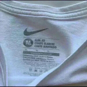 NIKE slim fit T-shirt. This is a white shirt with a blue nike logo. This shirt is a slim fit so it sits a s-m. Great condition. No rips,cracks, or stains.