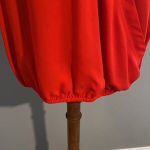 Red V-neck Blouse size medium 3/4 sleeve. Elastic at waist. 100% polyester. Bust measures 40” around.