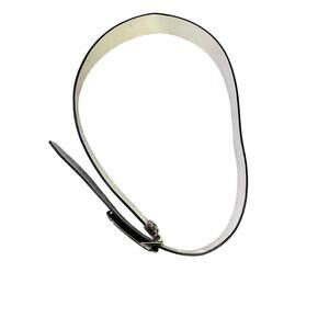 Guess belt, characterized by a silver-toned buckle adorned with the repeating "G" logo and rhinestones. The strap is black, with a white interior. Very good pre-owned condition. 42” in length