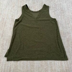 A green workout tank top with v-neck back and side slit design. The care tag says it's an XS, I think the X might have washed off on the back label