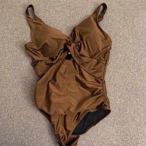 Never worn. Stylish brown one-piece with a twist front design. Ideal for a sophisticated beach day.